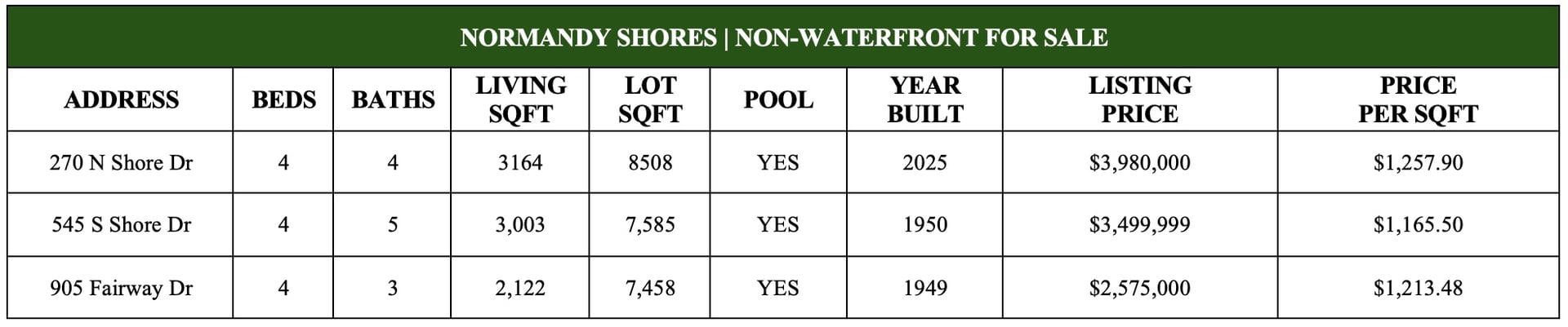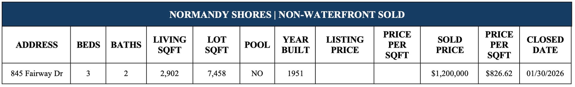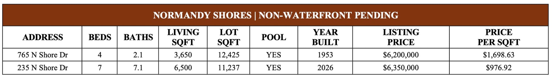 Normandy Shores is firmly positioned as a luxury-driven market, with Q1 2026 highlighting its bifurcated nature between ultra-luxury waterfront and golf course interior homes.